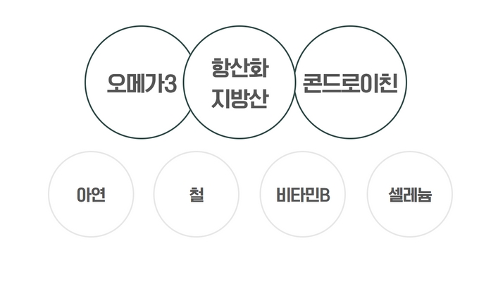 일반적인 오메가3 뿐만 아니라 염증과 통증을 일으키는 단백질과 효소를 막는 항산화 지방산이 있었습니다. 또한 여기에는 연골 성분으로 유명하며 항산화 지방산과 같은 방식으로 염증에 따른 통증을 줄이는 콘드로이친이 함유되어 있었습니다. 그리고 아연, 철, 셀레늄, 비타민B등 중요 미네랄을 함유하고 있는 영양의 보고임이 알려지게 되었습니다.
