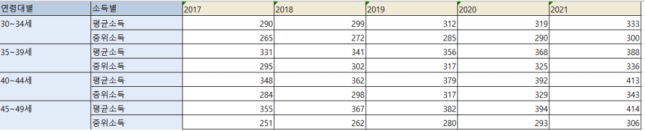 [1] 근로자 기준 30대 40대 월 평균소득과 중위소득