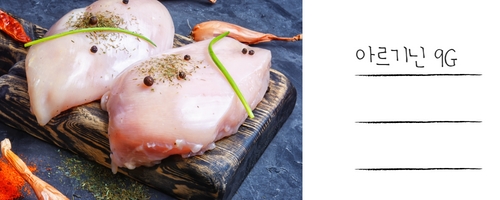 닭가슴살 한 덩이에는 하루 권장단백질의 70%와 9g의 arginine을 담고 있습니다. 운동하시는 분들이 왜 닭가슴을 사랑하는지 알 수 있는 함유량입니다.